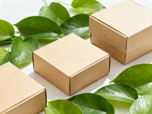 biodegradable kraft boxes with green leaves around, recyclable material concept, clean eco branding