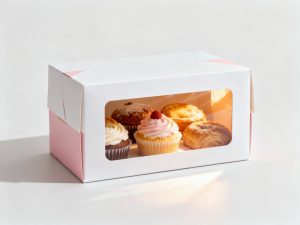 bakery packaging with cupcakes and pastries visible through window, custom printed cake box, bright natural light