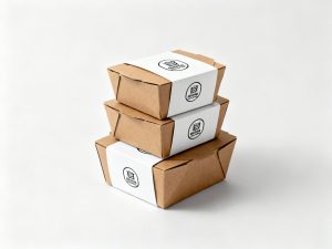 stack of branded take-out food boxes with printed logo, ready for delivery, brown kraft and white colors, modern packaging design